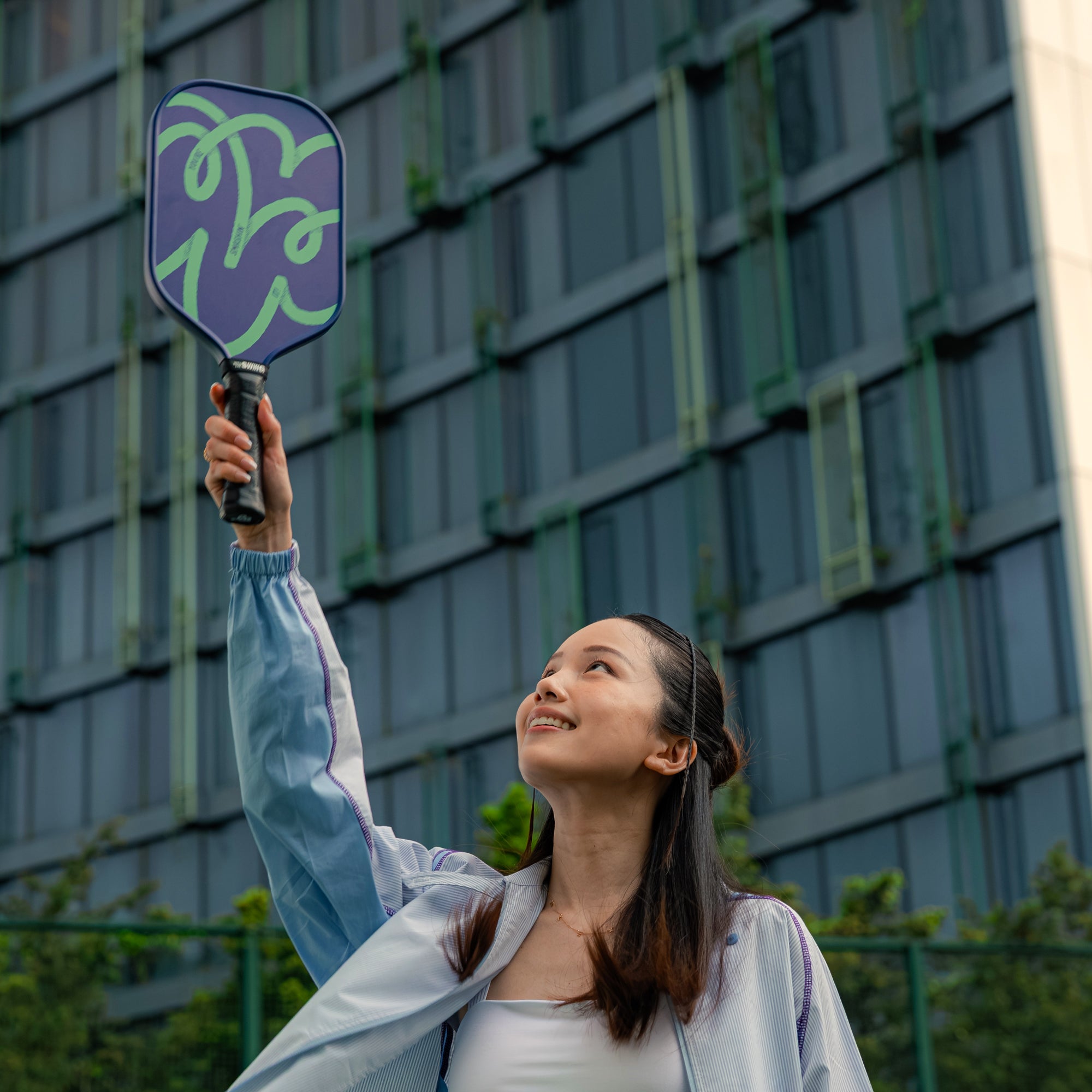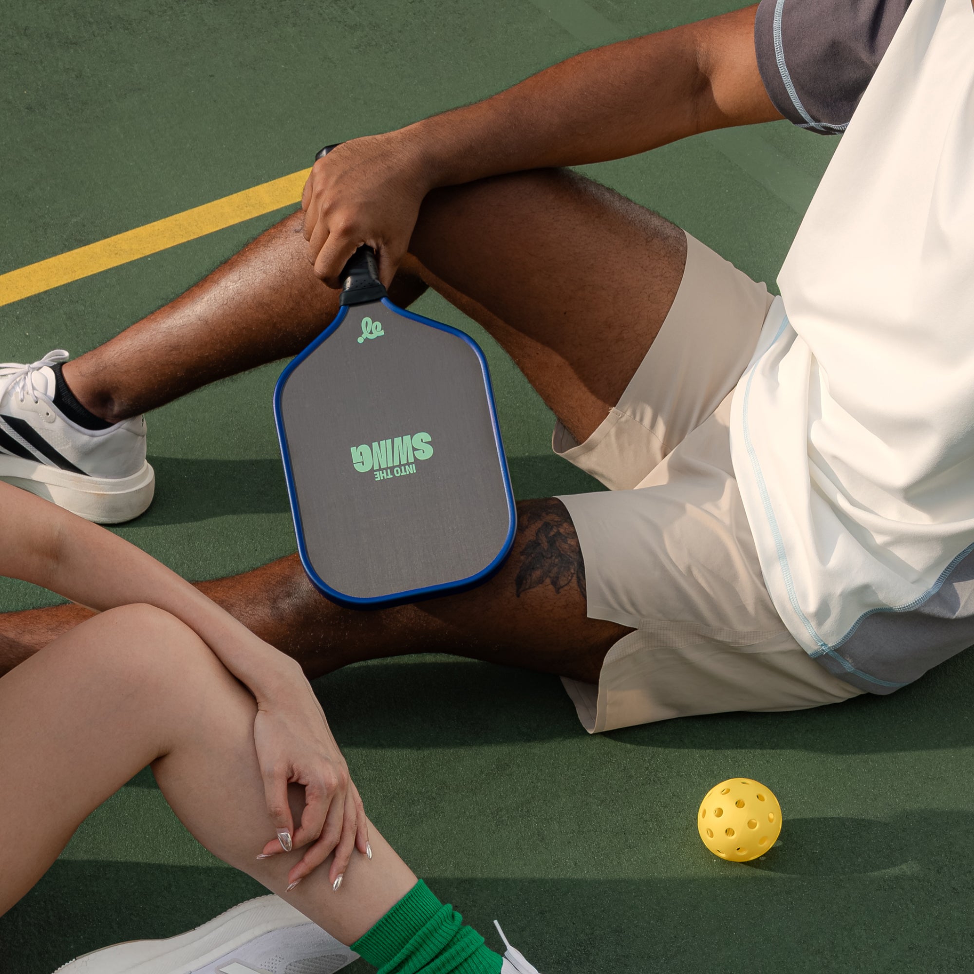 Loose, wavy lines ripple across the surface like the playful movement of a pickleball rally―this paddle captures the rhythm of the game. Tucked along one wiggle, a quiet boost: “You’re Smashin' It.” Subtle. Encouraging. Spot on.